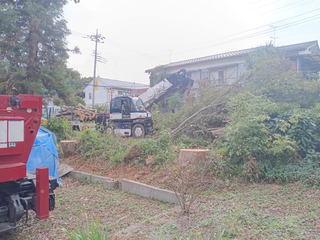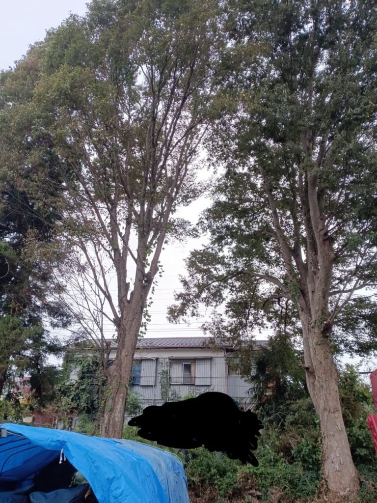 欅の木、2本の伐採。敷地にクレーンと高所作業車、切った枝を降ろす場所、そして枝を置く場所を考えると狭いので、隣の場所を借りて高所作業車を設置して作業しました。