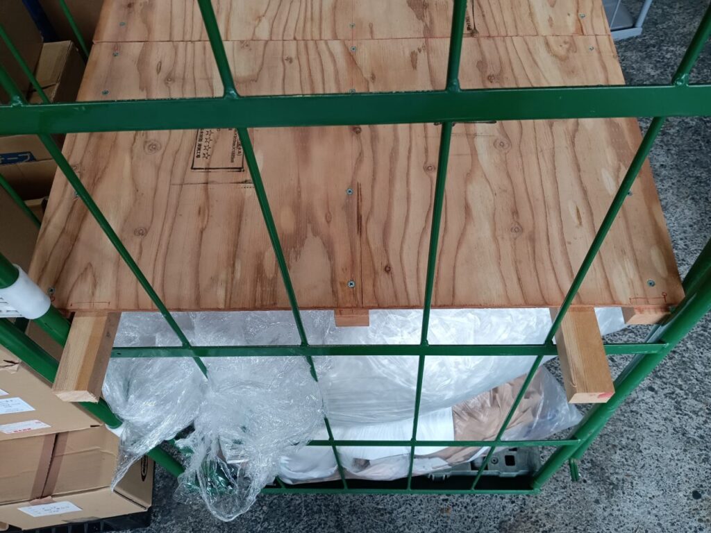 というわけで、今日は雨の為伐採現場はお休み。なので、依頼の有りましたカゴ台車用の棚作成をしてました。垂木を流してそこにベニヤを乗せて作成。これで私が乗っても平気な強度はあります。