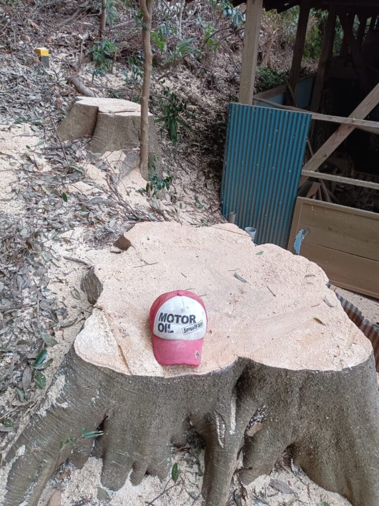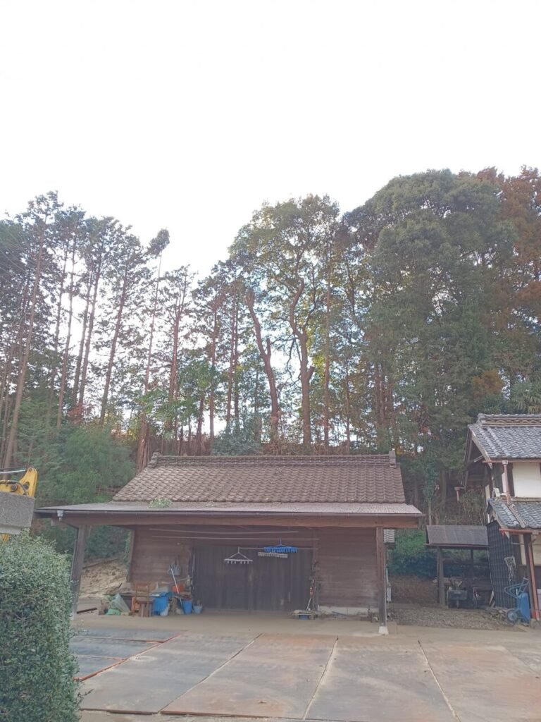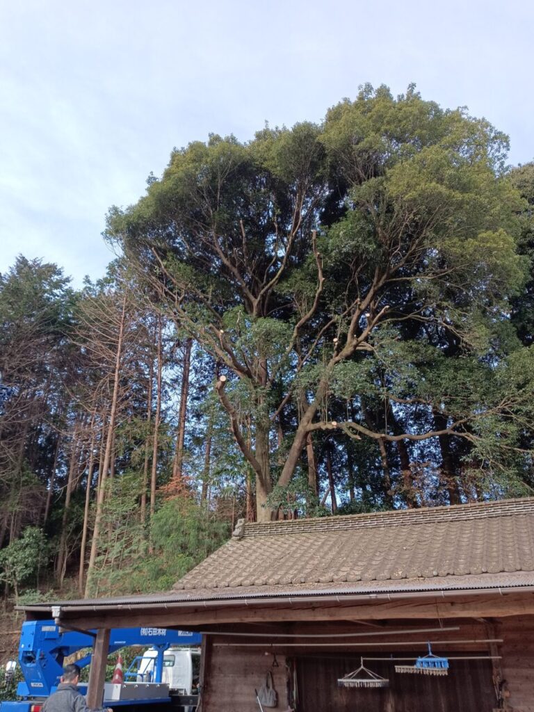 今日の伐採した樫の木、そこそこ大きかったです。目通り大体8尺かな?大体240cmから250cm位。樹高で大体23mはあったかと思います。(22m高所作業車でほぼ真上に上げて大体上まで行ったのでそのくらいなのかな?と)これと、目通りで大体3尺、約90cm程度の樹高がやはり23m位の2本を元から伐採。そして、その隣にあった樫の木3本のクレーンの届く範囲での枝下ろし。なかなか綺麗に枝を下ろすことが出来ました。写真を見ても、木の後ろのあかりが良く入る様になりました。