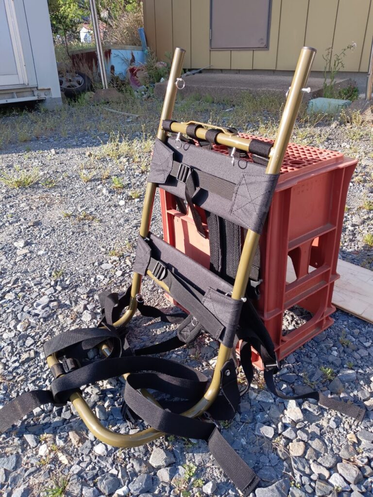 今日は、初めての本当の山の中でのお仕事して来ました。登山道の上に杉の木が根っこが持ち上がりながら倒木してしまっていて、危険なので伐採する為に現場へ行くのに、本当に山の中なので車で行けず、重機もとても行ける場所でも無いので、今回この現場の為だけにになりそうだけど【背負子】を買いました。